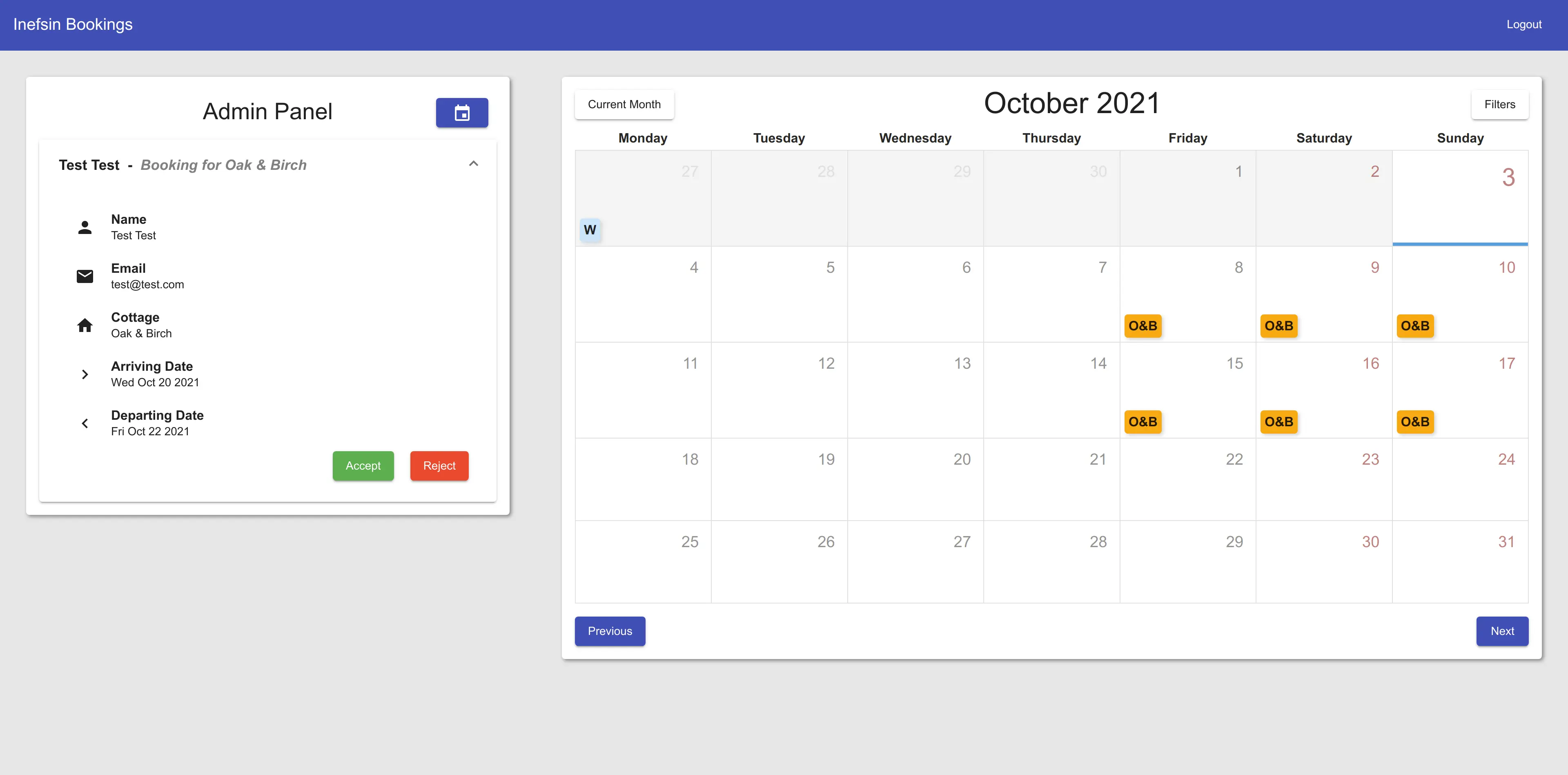 Admins can review these booking requests in a separate panel and either accept or reject them, emailing users the result.